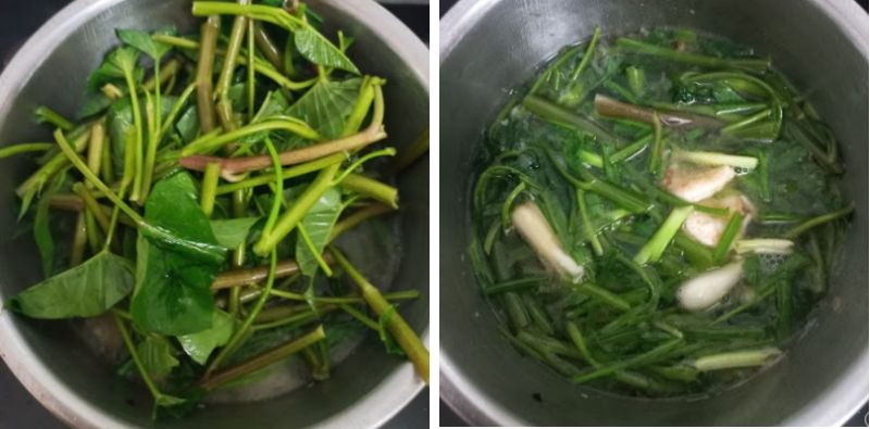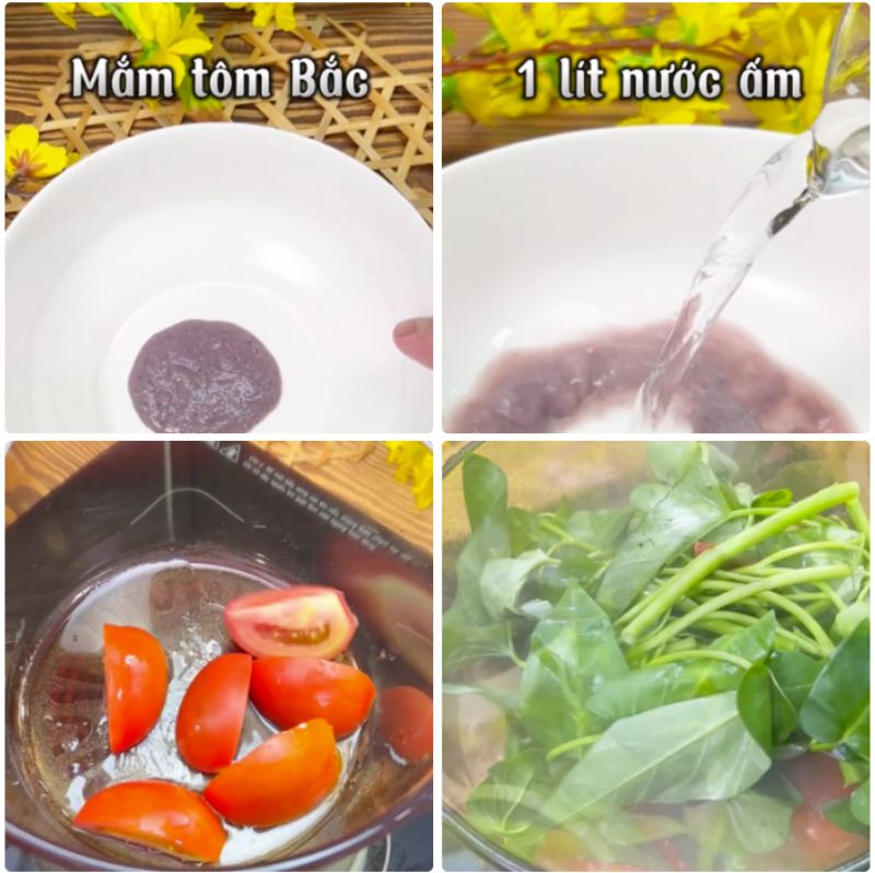 Lần lượt các bước nấu canh rau muống với mắm tôm bắc