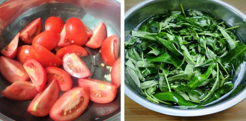 Rau muống sau khi mua về, bạn lặt lấy cọng rồi bỏ bớt lá. Ngâm rau muống qua nước muối và rửa lại thật sạch với nước. Phần cà chua bạn rửa sạch, cắt bỏ phần lõi cuống và bổ thành dạng miếng cau.
