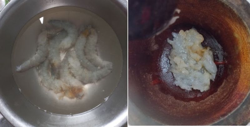 Một phần tôm đập dập, còn 1 phần bạn đem giã nhuyễn