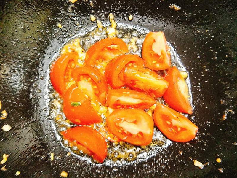 Bắc nồi lên bếp, cho chút dầu ăn và hành khô phi thơm. Thêm cà chua vào xào đến khi nhuyễn, ra màu đỏ đẹp thì cho sườn vào đảo cùng để thấm gia vị.