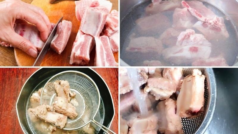 Rửa sạch sườn, chặt miếng vừa ăn rồi chần qua nước sôi khoảng 2–3 phút để loại bỏ mùi hôi và cặn bẩn. Vớt ra rửa lại với nước lạnh, để ráo.