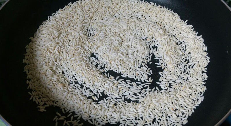 Công đoạn tiếp đến là rang gạo và xào nấm chín trước khi nấu cháo, để rang gạo bạn bắc chảo lên bếp và cho 2 muỗng dầu ăn. Khi dầu đã già, cho thêm 1 ít hành tím băm hoặc tỏi vào phi thơm. Khi tỏi, hành đã được phi thơm thì cho gạo vào đảo khoảng 6 phút, khi gạo chuyển sang màu trắng đục thì tắt bếp. Nếu sử dụng bếp từ bạn nên sử dụng dòng chảo bếp từ hoặc chảo inox.