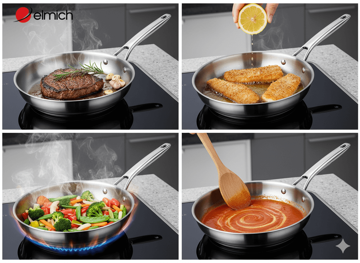 Với một chiếc chảo inox nguyên khối, bạn có thể tự tin thực hiện mọi kỹ thuật nấu nướng từ Á đến Âu: áp chảo bò bít tết cháy cạnh hoàn hảo, chiên cá vàng giòn, xào rau củ nhanh lửa lớn, hay thậm chí làm các món sốt sánh mịn.