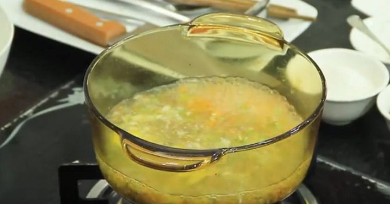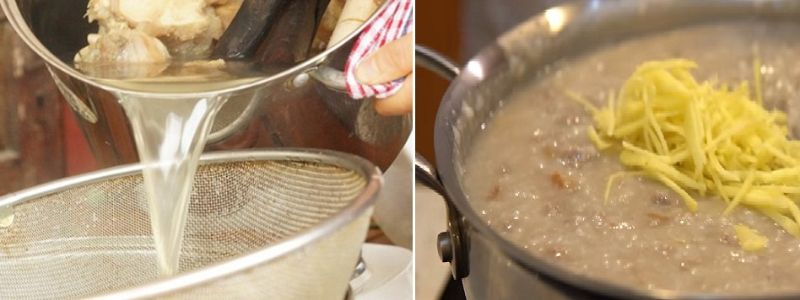 Khi đã có nước dùng xương, bạn lọc nước qua rây thật kỹ để lấy phần nước trong và không có cặn. Đổ nước dùng đã lọc sạch vào nồi, sau đó đổ phần gạo đã vo sạch nấu đến khi gạo cháo nhừ.