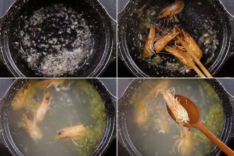 Trong một nồi nhỏ, bạn cho dầu ăn vào và bắt đầu phi hành. Khi hành vàng thơm thì thả đầu tôm vào, đảo sơ đến khi đầu tôm chuyển màu đỏ hồng thì thêm vào nồi 1200 ml nước. Đậy nắp, sau đó nấu sôi khoảng 5 phút thì vớt đầu tôm ra, gạn lấy nước dùng trong.