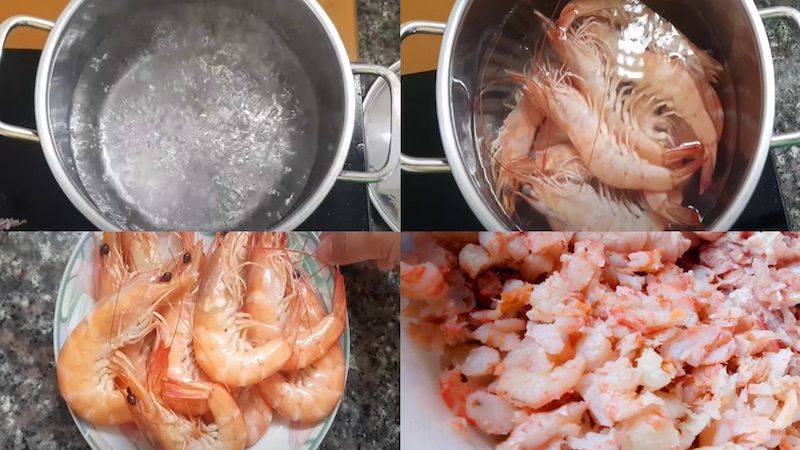 Bạn cho tôm vào nồi với khoảng 500 ml nước, sau đó đun sôi, cho vào nồi 1 nhúm muối trắng. Luộc tôm trong khoảng 5 đến 7 phút để cho tôm chín tới thì vớt ra để tôm nguội hoàn toàn. Sau đó bạn bóc vỏ, loại bỏ phần đầu, đuôi sau đó băm nhuyễn thịt tôm.