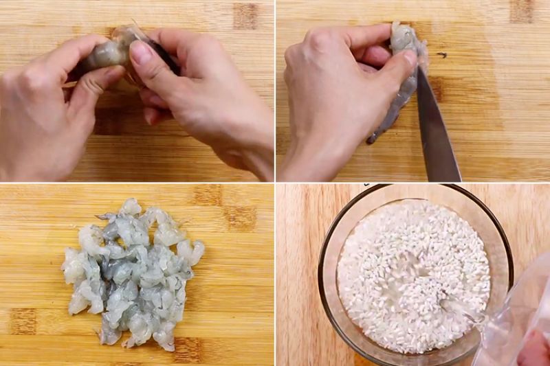 Tôm bạn rửa sạch, tách riêng đầu và thân sau đó bóc vỏ, loại bỏ chỉ đen lưng tôm và băm nhỏ thịt tôm.