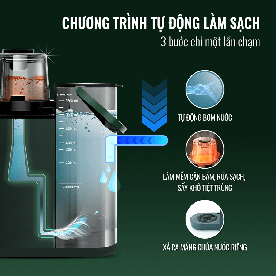 Nhờ khả năng tự động bơm nước làm sạch và sấy tiệt trùng cối xay ngay sau khi sử dụng mà việc vệ sinh máy sau khi sử dụng cũng trở nên tiện lợi, dễ dàng và tiết kiệm thời gian hơn bao giờ hết. Phần nước rửa sẽ được thoát ra khay chứa, bạn chỉ cần vệ sinh phần khay chứa này, sau đó có thể sử dụng máy cho các lần tiếp theo.