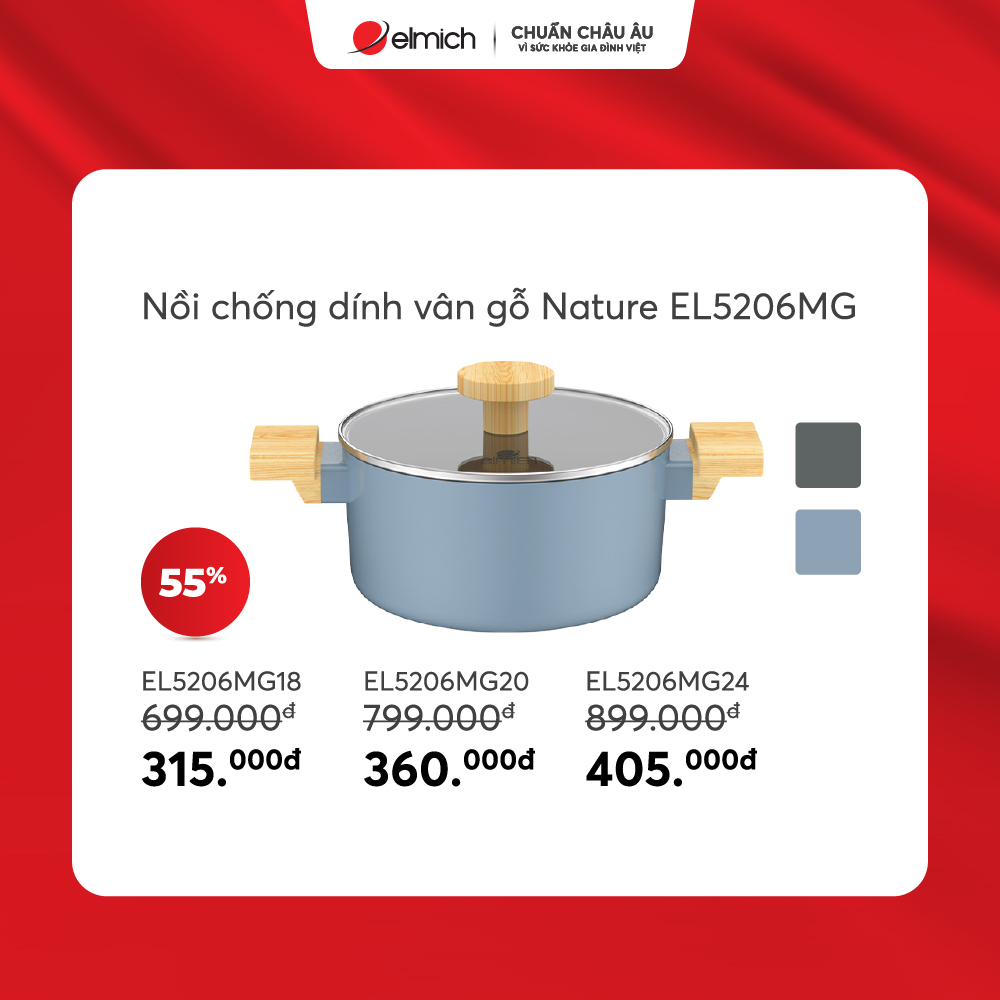 - Nồi chống dính vân gỗ Elmich Nature EL5206MG18 size 18cm chỉ 315K, giá gốc 699K