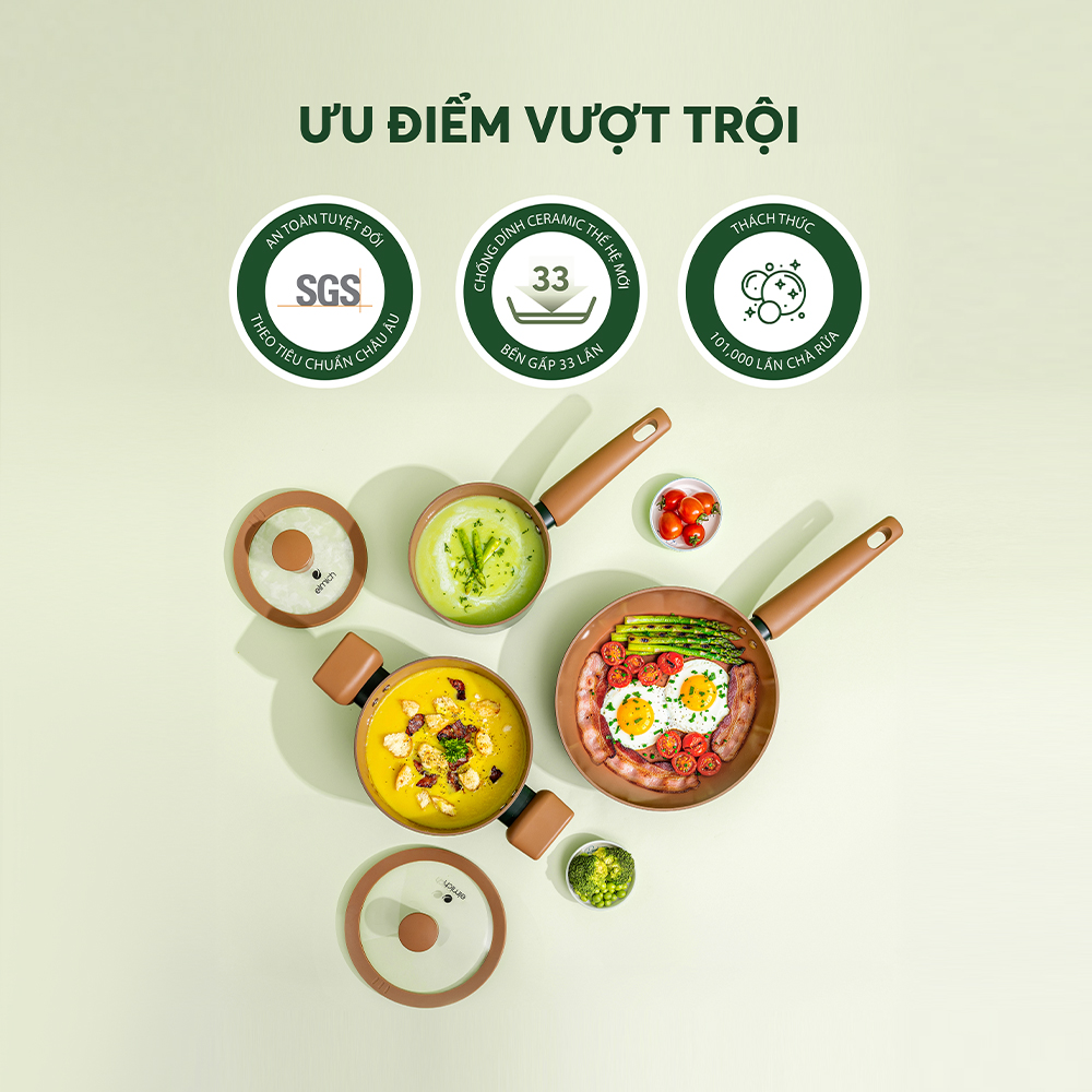 An toàn tuyệt đối: Lớp chống dính Ceramic được làm từ các vật liệu tự nhiên, không chứa các chất độc hại như PFOA, PFOS, chì hay Cadmium, đảm bảo thức ăn nấu ra không bị nhiễm hóa chất ngay cả ở nhiệt độ cao.