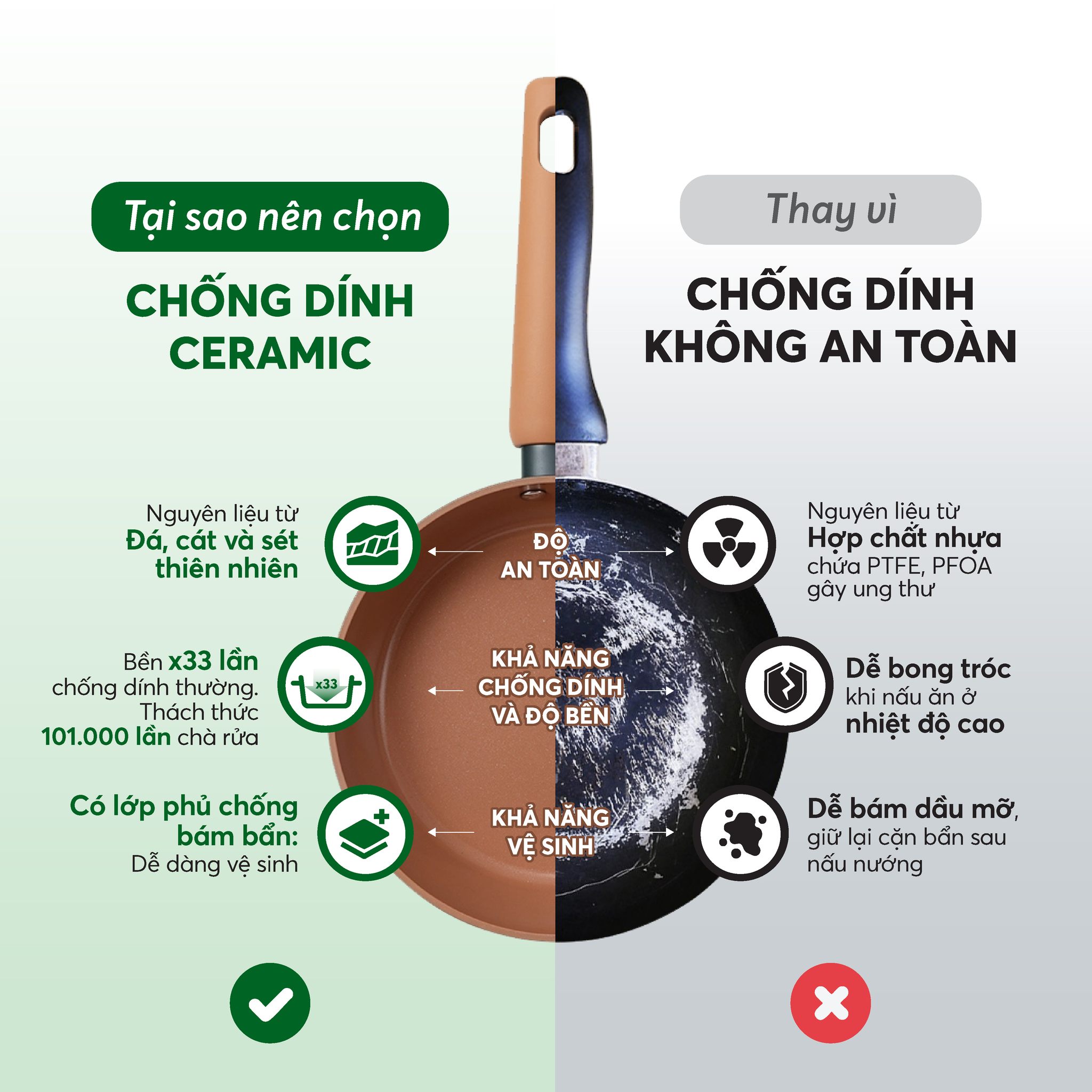 | Độ an toàn | Tuyệt đối (Không PFOA, PTFE) | Có thể chứa hóa chất gây hại |