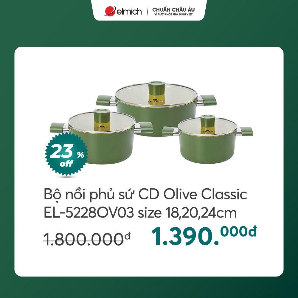 - Bộ nồi phủ sứ CD Olive Classic EL-5228OV03 size 18,20,24cm chỉ còn 1390K, giá gốc 1800K