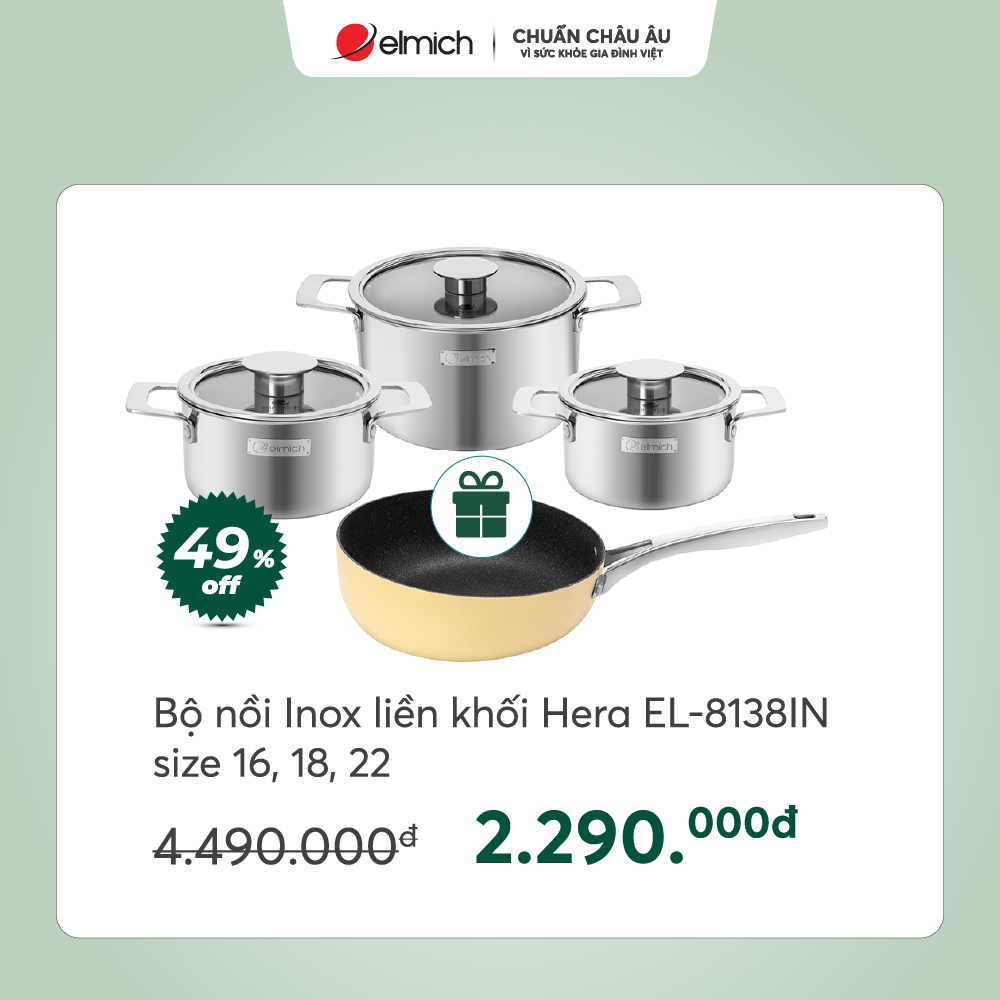 - Bộ nồi Inox liền khối Hera EL-8138IN size 16, 18, 22cm chỉ còn 2.290.000đ, giá gốc 4.490.000đ