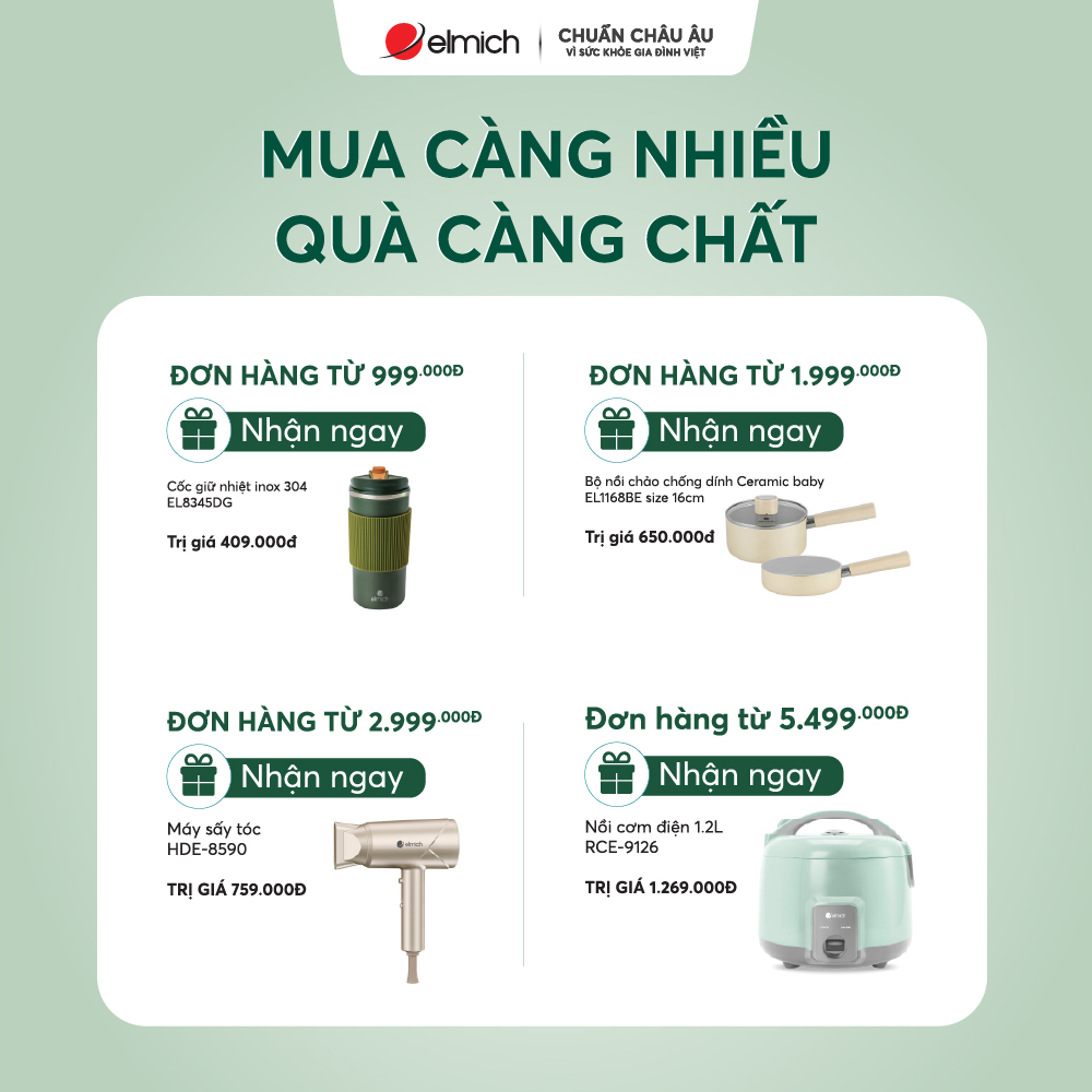 | > 5.499.000đ | Nồi cơm điện Elmich 1.2L RCE-9126 – Trị giá 1.269.000đ |
