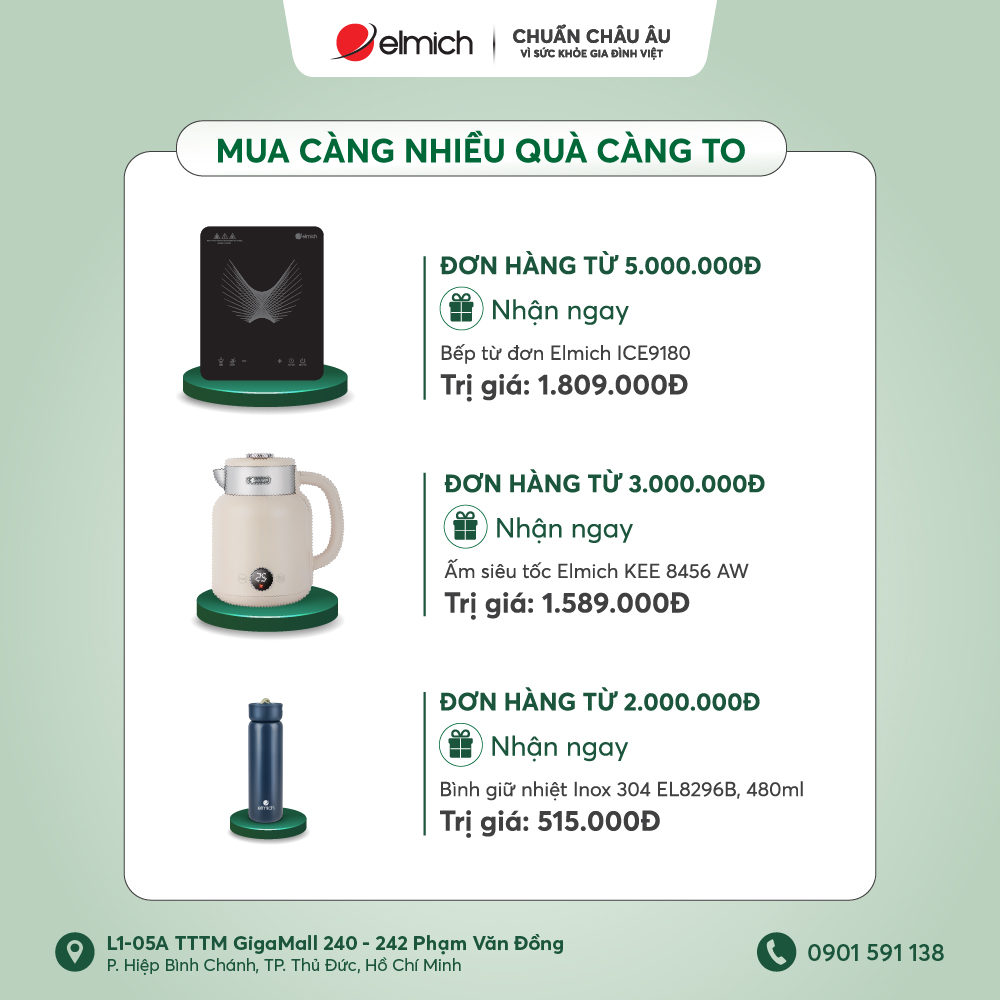 • Đơn từ 3.000.000đ: Tặng ấm đun siêu tốc Elmich KEE-8456AW (1.5L) – trị giá 1.500.000đ