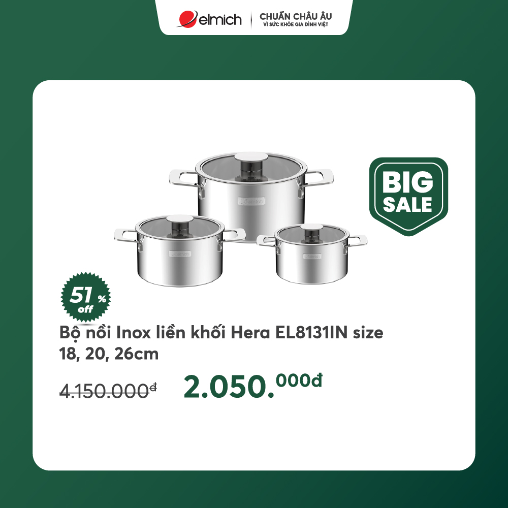 - Bộ nồi Inox liền khối Elmich Hera EL8131IN size 18, 20, 26cm chỉ 2050K, giá gốc 4150K