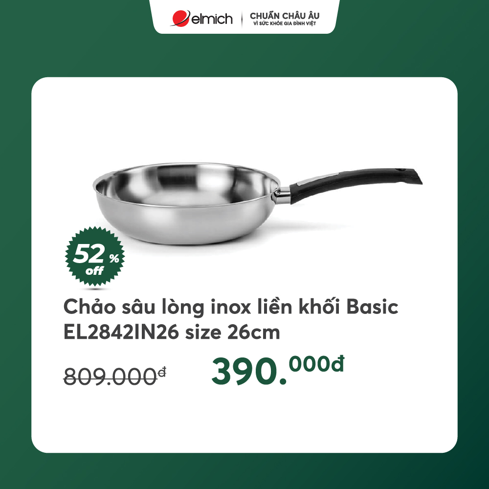 - Chảo sâu lòng Inox liền khối Elmich Basic EL2842IN26 size 26cm chỉ 390K, giá gốc 809K