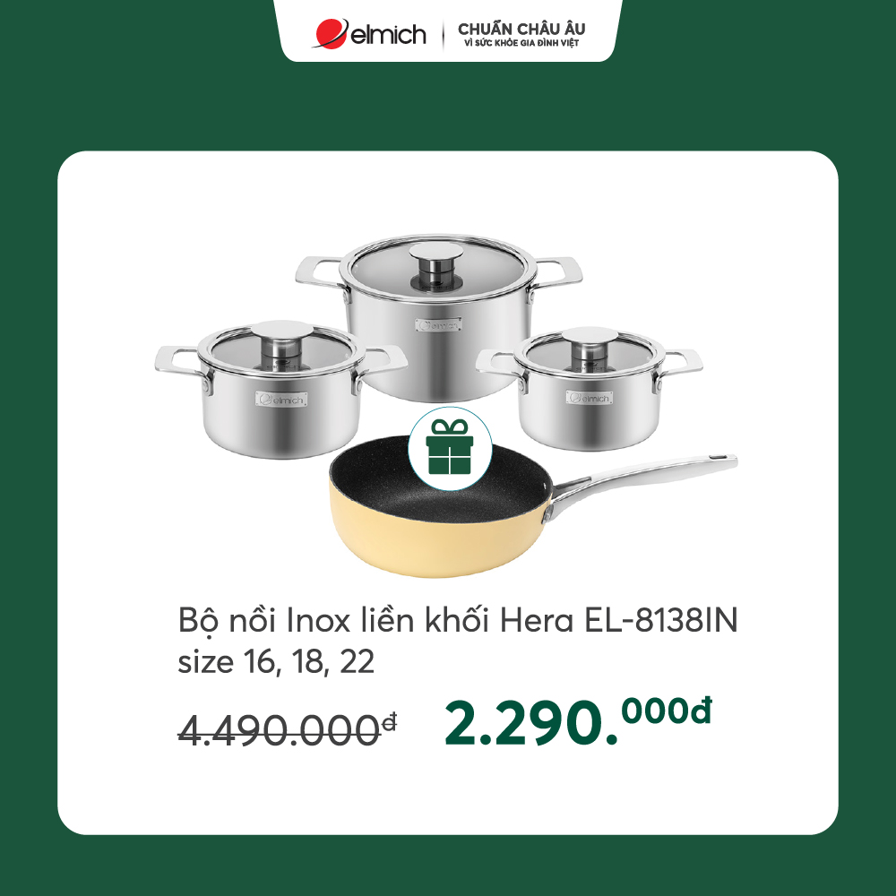 - Bộ nồi Inox liền khối Hera EL-8138IN size 16,18,22cm chỉ còn 2290K, giá gốc 4490K