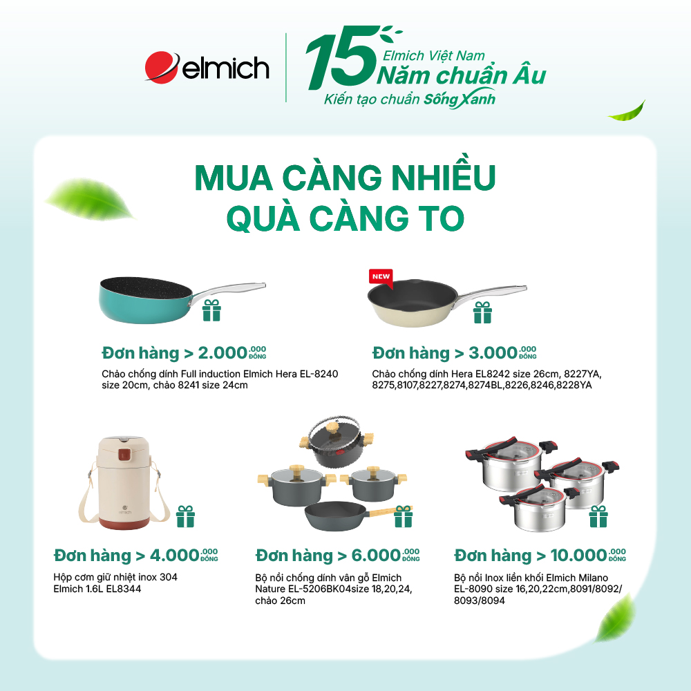 Trong khuôn khổ chương trình kỷ niệm 15 năm, Elmich dành tặng Quý khách ưu đãi đặc biệt: giá trị hóa đơn càng cao, quà tặng càng hấp dẫn. Đây là dịp lý tưởng để lựa chọn trọn bộ sản phẩm gia dụng chất lượng, đồng thời nhận thêm những phần quà thiết thực cho gia đình.