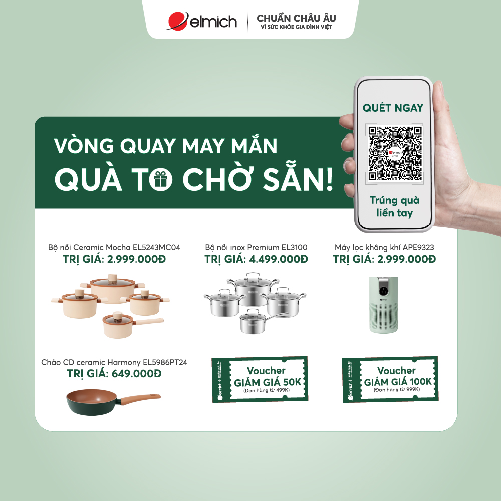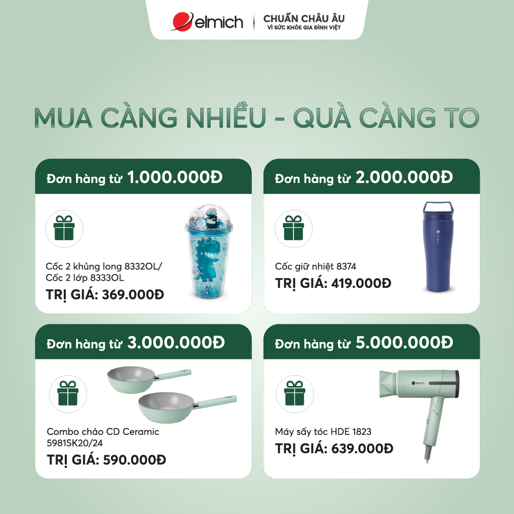 Không chỉ săn sale, khách hàng còn nhận ưu đãi kép cực hời từ Elmich! Nhận ưu đãi sâu đến 50%++, vừa nhận thêm quà tặng theo giá trị đơn hàng – từ cốc giữ nhiệt, chảo chống dính đến máy lọc không khí cao cấp.