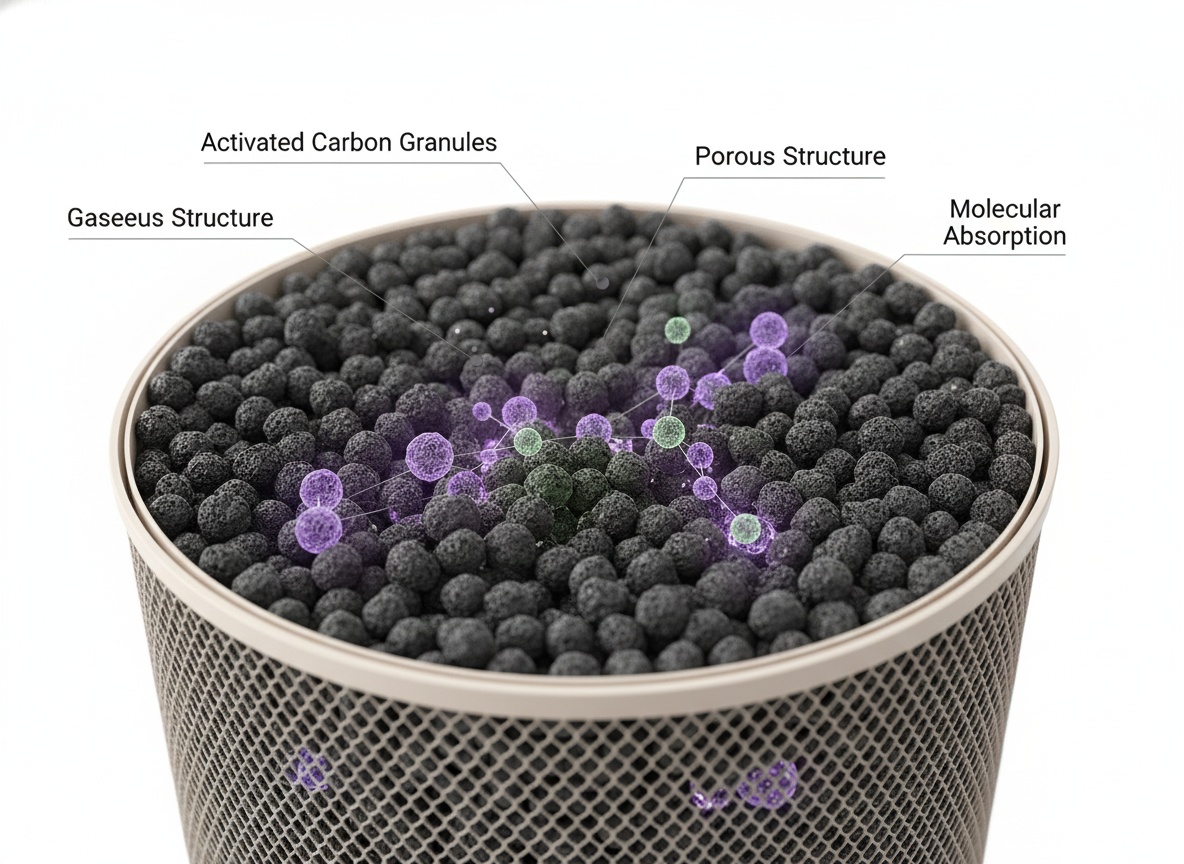 Nguyên lý hoạt động: Lọc than hoạt tính được làm từ than gỗ, than đá hoặc gáo dừa đã qua xử lý đặc biệt ở nhiệt độ cao để tạo ra hàng tỷ lỗ rỗng siêu nhỏ. Cấu trúc xốp này tạo ra một diện tích bề mặt cực lớn, cho phép than hoạt tính hấp phụ các phân tử khí, hơi hóa chất và mùi hôi thông qua quá trình hấp phụ vật lý và hóa học. Các phân tử gây mùi và khí độc sẽ bị giữ lại trên bề mặt than.