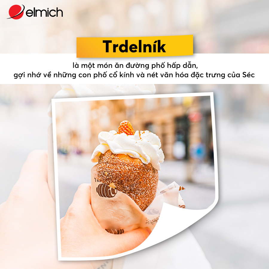 Không thể thiếu trong danh sách này chính là Trdelník, món tráng miệng truyền thống của Séc - quê hương thương hiệu Elmich. Trdelník là một loại bánh mì ngọt nướng, được cuộn quanh một que gỗ và phủ đường, quế và hạnh nhân. Khi nướng, lớp vỏ giòn tan và thơm lừng, còn bên trong mềm mịn và ngọt ngào. Đây là một món ăn đường phố hấp dẫn, gợi nhớ về những con phố cổ kính và nét văn hóa đặc trưng của Séc.