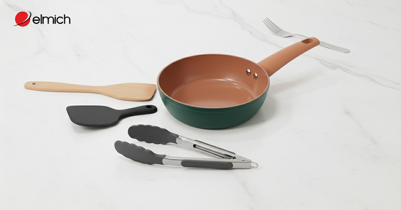 Nên dùng: Dụng cụ bằng silicone (chịu nhiệt), gỗ, tre, hoặc nhựa chịu nhiệt (nylon). Bộ vá/muỗng silicone của Elmich là lựa chọn hoàn hảo vì chúng mềm dẻo, chịu nhiệt cao và không làm xước mặt chảo.