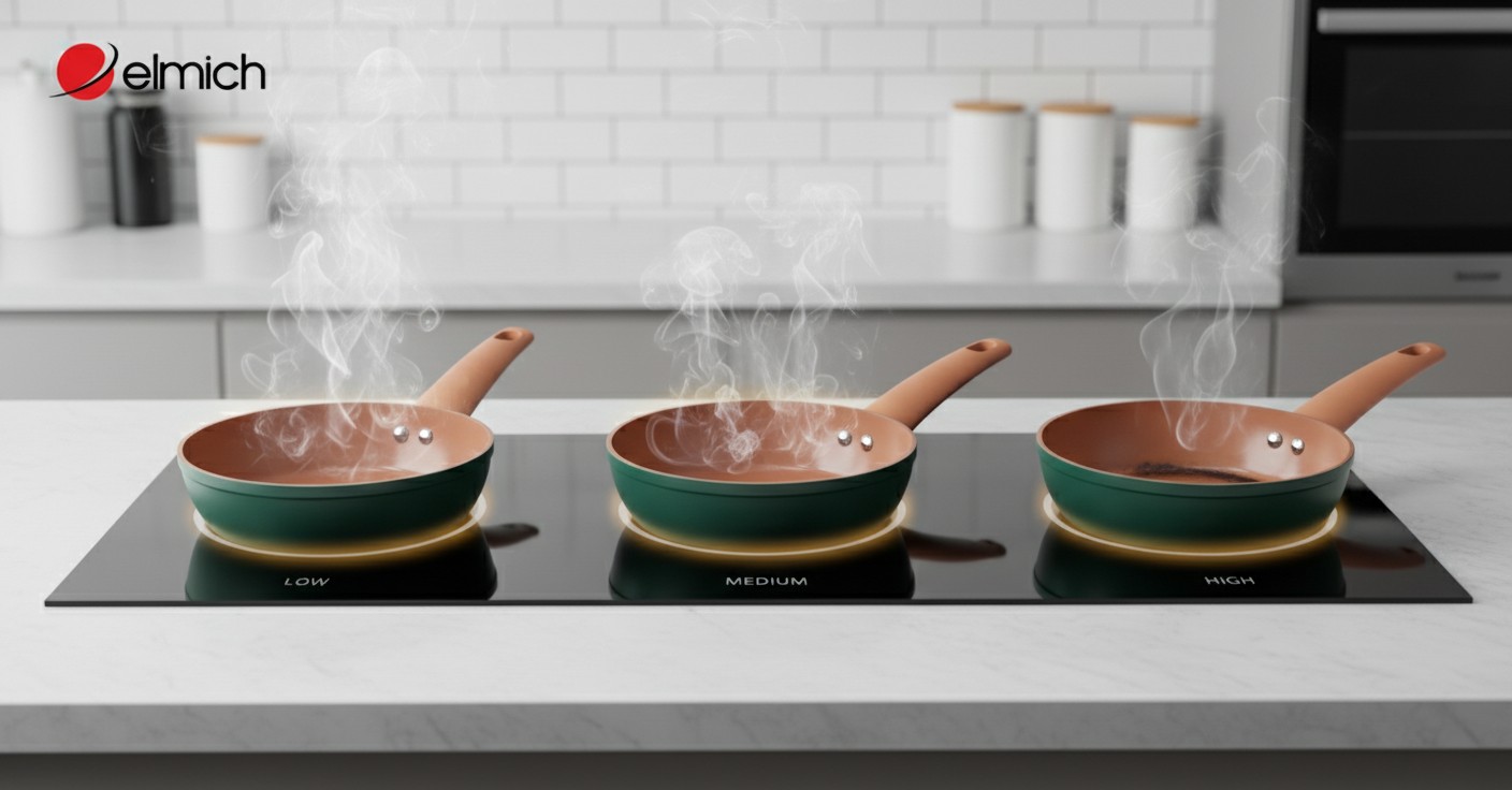 Đây là kinh nghiệm quan trọng nhất. Nồi chảo ceramic (đặc biệt là các dòng chảo Elmich có đáy từ Smart IH) có khả năng dẫn nhiệt và giữ nhiệt VƯỢT TRỘI so với chảo nhôm mỏng thông thường.