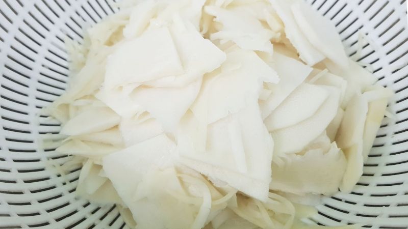 Măng đem rửa sạch, bào thành những miếng mỏng. Cho măng vào trụng với nước sôi khoảng 5 phút để loại bỏ hoàn toàn vị đắng. Sau đó rửa sạch lại với nước, để ráo nước.