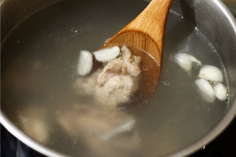 Bạn đun một nồi nước sôi, cho phần xương cá vào trần với muối khoảng 2 phút. Sau đó vớt ra rửa lại thật sạch. Sau đó bạn cho xương vào hầm với 1,5 lít nước và vài nhánh hành tìm trong 1 tiếng để xương cá, đầu cá ra nước ngọt.