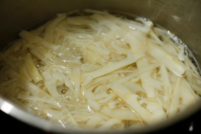 Măng chua đem luộc với nước muối khoảng 5 phút sau đó rửa lại với nước lạnh. Để cho ráo nước hoàn toàn.