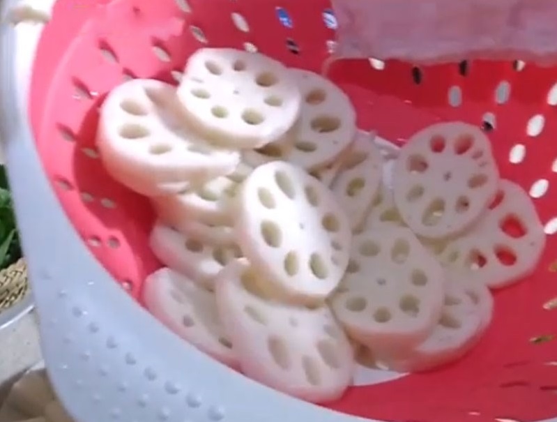 Củ sen bạn gọt sạch vỏ, cắt thành từng khoanh mỏng vừa ăn với độ dày cỡ bằng nửa lóng tay. Sau đó ngâm củ sen trong nước khoảng 10 phút, vớt ra để cho ráo nước.