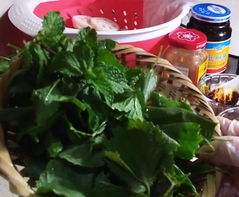 Bạn rửa thật sạch rau xà lách xoong, tía tô. Nhặt bỏ các lá xấu sau đó rửa lại một lần nữa với nước và để lên rổ cho ráo nước.