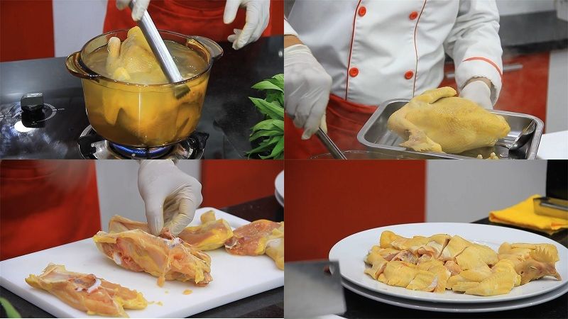 Gà ta đã làm sẵn, bạn rửa sạch bằng cách dùng một lát chanh chà trên bề mặt da gà. Sau đó rửa sạch lại với nước muối loãng, nước sạch để loại bỏ hoàn toàn mùi tanh, hôi. Trần sơ gà trong nước sôi 3 - 5 phút để thịt gà hơi săn lại và vớt ra, xả qua nước lạnh, để ráo nước.