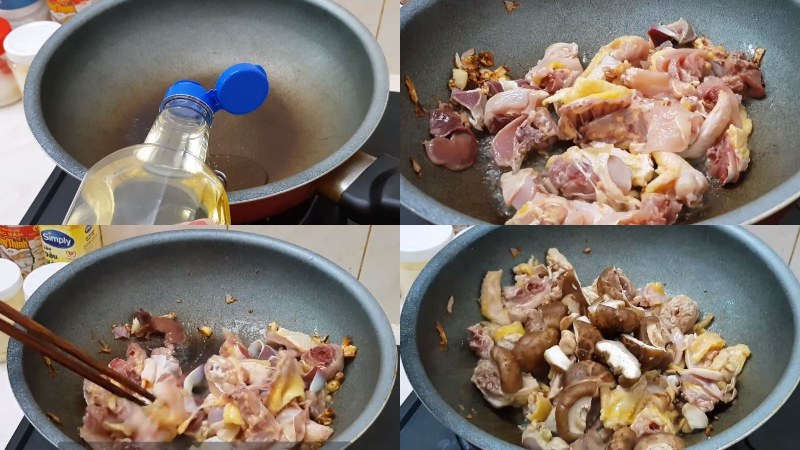 Lấy một nồi nấu lẩu khác để đun nóng một thìa dầu ăn rồi phi thơm tỏi băm và gừng, sả, ớt. Sau đó cho nấm vào xào chung. Khi nấm đã chín vàng, tiến hành cho nước ninh gà đã nấu trước đó vào nồi.