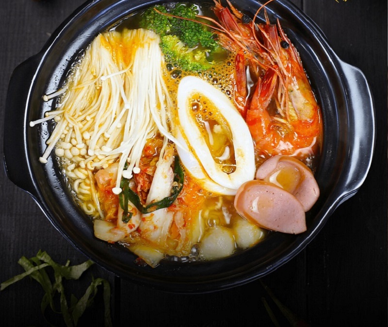 Cho một ít ớt cay, một gói mì Ramen, xúc xích, cá viên và súp lơ xanh cắt nhỏ vào nồi đất. Đổ nước dùng đã nấu vào ngập mì. Đậy nắp và đun nồi lửa lớn cho đến khi nước sôi. Sau đó, nhẹ nhàng khuấy đều để sợi mì tơi ra.