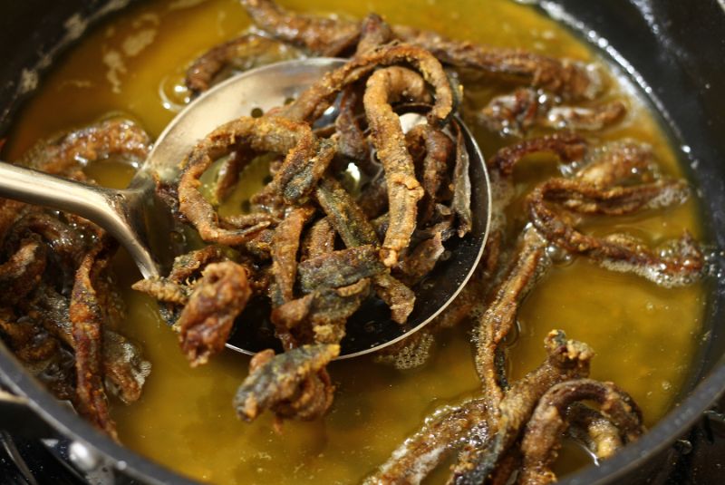 Thịt lươn sau khi tẩm ướp các gia vị cần thiết, bạn cho vào chảo chiên giòn lên là