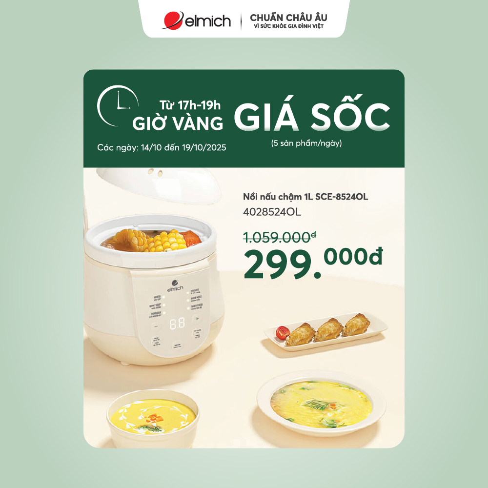 Trong khung giờ 17h – 18h mỗi ngày trong thời gian diễn ra sự kiện từ 14/10 – 19/10/2025, Elmich mang đến cơ hội sở hữu Nồi nấu chậm Elmich 1L SCE-8524OL với mức giá không tưởng – chỉ 299.000Đ (giá niêm yết 1.059.000Đ).