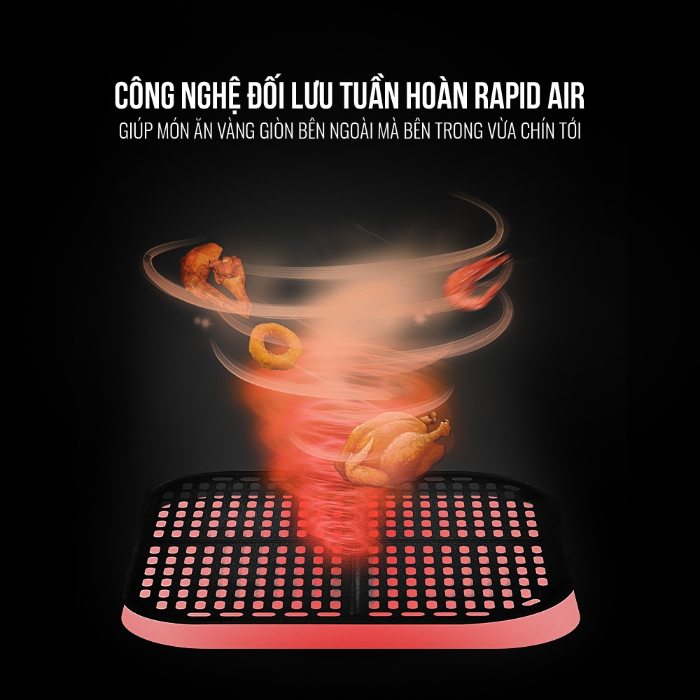 Không khí nóng sẽ luân chuyển liên tục xung quanh thực phẩm, giúp thực phẩm chín đều từ mọi phía hạn chế tình trạng chỗ cháy xém, chỗ bị sống.