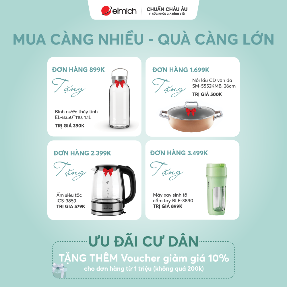 - Đơn hàng từ 3.499K tặng ngay máy xay sinh tố cầm tay Elmich BLE-3890 trị giá 899k
