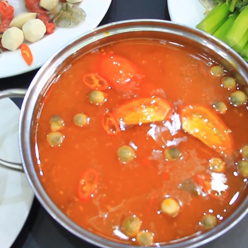Cho phần hỗn hợp vừa rồi vào nước dùng lẩu. Khuấy đều sau đó nêm nếm các loại gia vị cần thiết. Đợi đến khi nước sôi lên thì cho lá chanh, ớt cắt nhuyễn và nấm rơm, cà chua cắt múi cao vào nồi là hoàn thành. Bạn có thể bắc nồi ra ăn cùng các đồ nhúng đã chuẩn bị.
