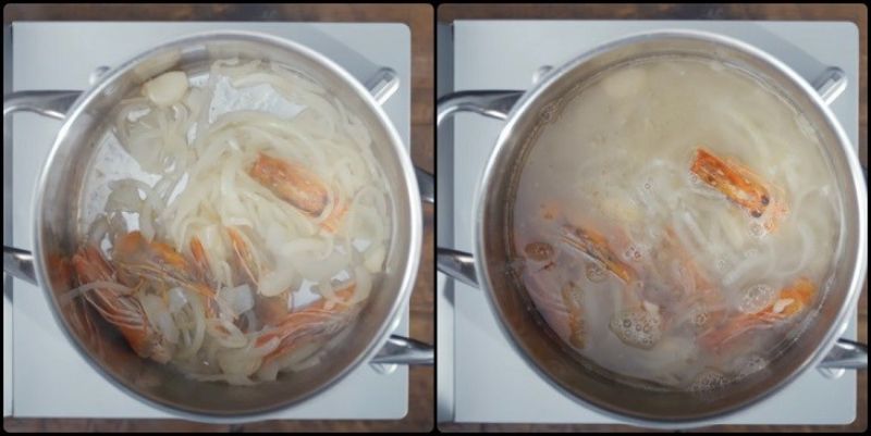 Cho dầu ăn vào nồi, phi thơm tỏi sau đó cho hành tây vào xào. Khi hành tây chín sơ, cho đầu tôm đã tách vào cùng với 1 ít nước và khuấy thật đều.