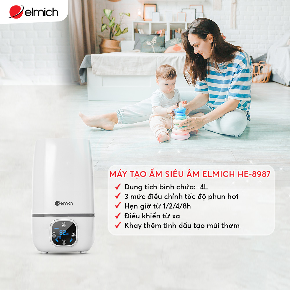 - Máy tạo ẩm siêu âm Elmich HE-8987 ưu việt với điều khiển từ xa, bình chứa dung tích lớn đảm bảo sử dụng không bị gián đoạn