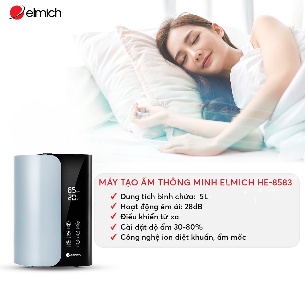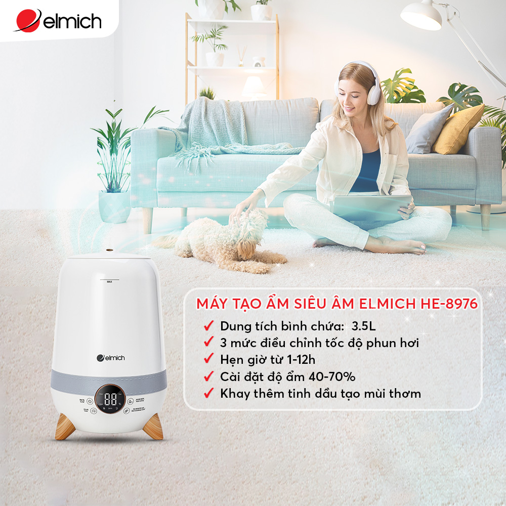 - Máy tạo ẩm siêu âm Elmich HE-8976 nổi bật với thiết kế nhỏ gọn, có thể cài đặt độ ẩm theo độ ẩm của phòng, chức năng hẹn giờ đến 12 tiếng