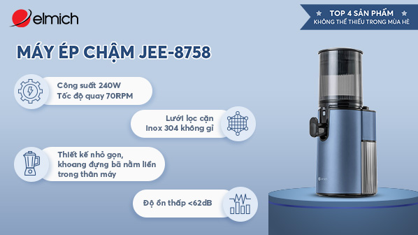 Xế chiều hơi khát có ngay trợ thủ Máy ép chậm Elmich JEE-8758 ép kiệt bã, bảo toàn dưỡng chất và vitamin, mang đến cốc nước ép thơm ngon, mát lạnh.